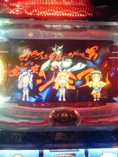 新台の聖闘士星矢より。 見づらいですが、CZ中の白銀聖闘士対決演出で海物語のキャラが出ました! 多分プレミアっすよね? しかしこの台はさすがパチンコメーカーと言うか、何が熱いのかサパーリわかりません(^-^; |